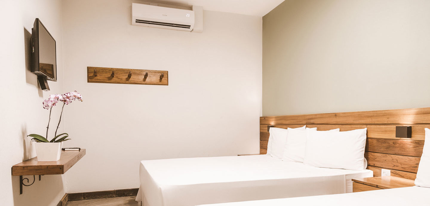 Apartamento novo e completo com uma cama de casal e duas camas de solteiro. Banheiro privativo, com ventokit. Janela bascula para corredor.